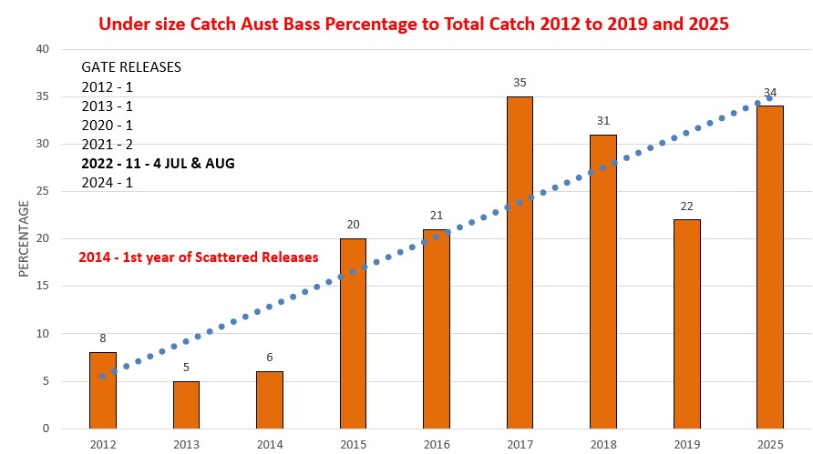 The following charts utilize the same type of analysis applied to the Bass population, providing insights into stocking efforts and catch results over time. However, due to the limited availability of historical data for Golden Perch, meaningful comparisons and trend evaluations are currently challenging. The absence of robust data from previous years highlights the importance of building a more extensive and reliable dataset to inform future management decisions.