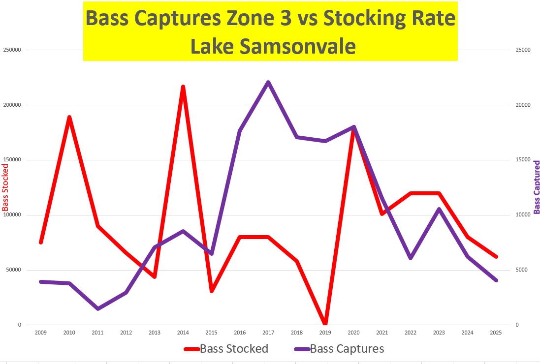 The accompanying chart illustrates the significant rise in Bass catch numbers several years after the high stocking effort in 2014. This delayed response demonstrates the “surge” effect, where variations in stocking rates result in observable changes in catch rates over time. By carefully analysing this data, we gain valuable insights into the lag time between stocking events and their impact on fish populations and fishing success.