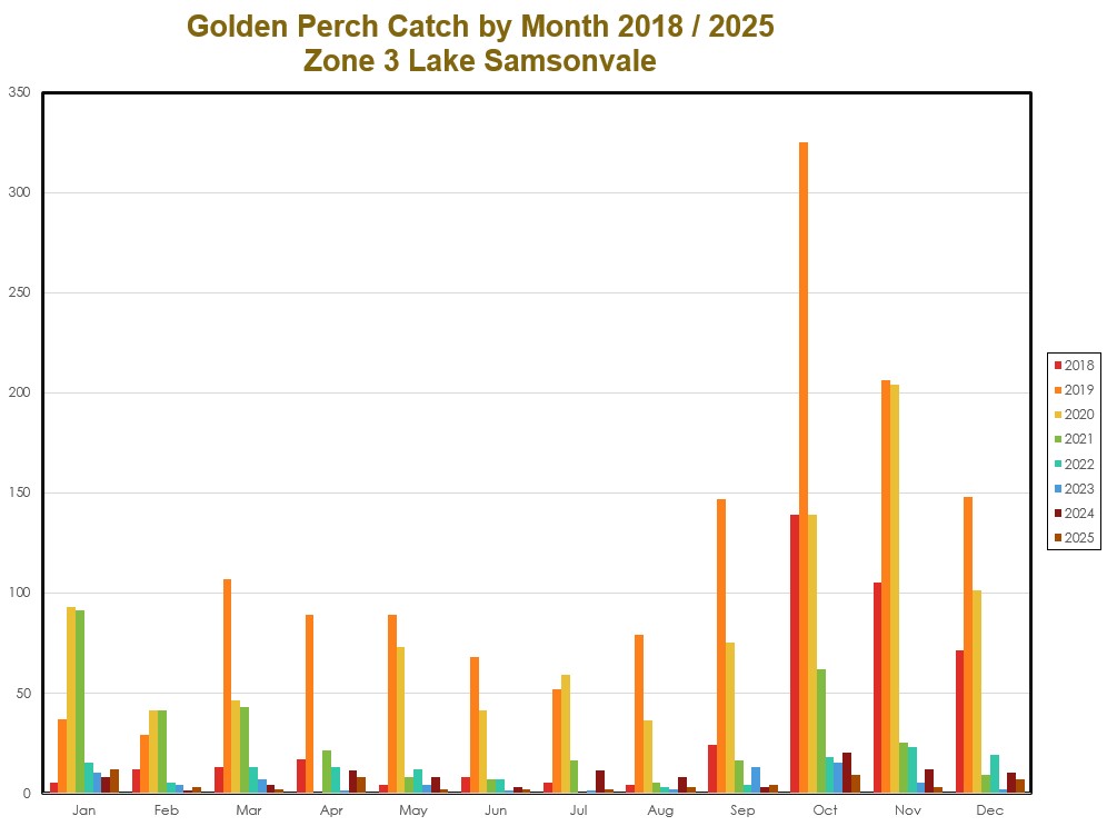 Golden Perch, affectionately known as “Yellas,” have been a part of the stocking efforts at Lake Samsonvale for many years. Despite this long history, very little data has been collected regarding the species’ population trends, catch rates, and overall performance within the fishery. To address this gap, a focused and structured data collection program has recently been initiated to gather more comprehensive information on this important species.