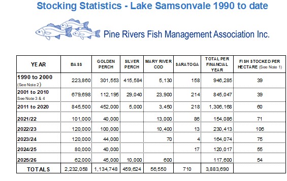 Since 1990 the following fingerlings have been released into Lake Samsonvale